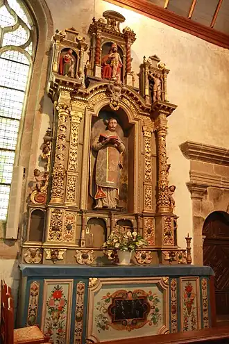 This building dates to 1667 and is attributed to G. Kerlezroux. The motto "Memento mori" is written above the ossuary door, contrasting with the fine carving of the Tree of life on the door itself; the sculptor juxtaposed images of life and death. Inside the ossuary there is an altarpiece depicting the resurrection with a depiction of the "Risen Lord" with Saint Sebastian to the left and Saint Roch on the right. Also to the left of the altarpiece are statues of Saint Anne and the Virgin Mary and on the right a statue of Saint Pol and the dragon. The "Mise au Tombeau" or Burial of Jesus, shown in the photographs which appear later, was originally in the ossuary, but was subsequently moved to the church. Above the door there is also a sculpture of a man's head: he gingerly strokes his beard. Thus in its overall imagery, the ossuary deals not just with death but life and resurrection.[5]