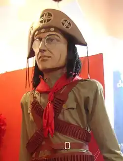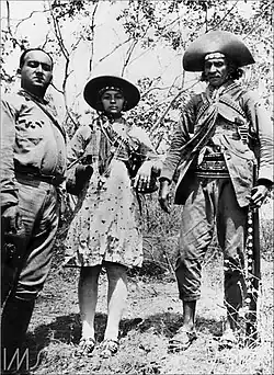Lampião was joined in 1930 by his girlfriend, Maria Déia, nicknamed Maria Bonita ("Pretty Maria").[21] His relationship with Maria Bonita gave his reputation some of the 'romance and violence' notoriety enjoyed in the United States by Bonnie and Clyde.[22] The women who joined bandit groups, often termed cangaceiras, dressed like their male comrades and participated in many of their actions. Maria and Lampião had a daughter, named Expedita, in 1932. A number of cangaceiras joined the band over the many years of its existence and Lampião usually attended any births these women had personally. Such children, including Lampião's own, were fostered out to settled relatives or friends of the cangaceiros, or left with priests.[23] Expedita, Maria and Lampião's daughter, born in 1932, was raised by her uncle João after the deaths of her parents. João Ferreira was the only one of Lampião's brothers not to become an outlaw.[24]