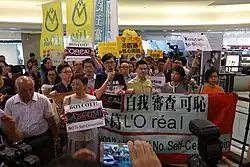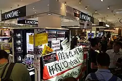 On 5 June 2016, Lancôme canceled a promotional concert by Hong Kong pro-democracy singer Denise Ho that was scheduled to be held on 19 June in Sheung Wan.[4] The cancellation was due to a boycott campaign launched by the Communist Party-controlled Global Times, which denigrated the Cantopop star for supposedly advocating Hong Kong and Tibet independence.[4] Lancôme posted on Facebook that Ho is not a spokesperson for the brand.[5] The cancellation drew a heavy backlash in Hong Kong, resulting in some Lancôme shops in Hong Kong shutting down during the protests.[6] Some Hong Kong merchants refused to accept the political pressure from the Chinese government.[7] Listerine, another brand that Ho represents, retained the singer despite criticism from the Global Times for hiring Ho as its spokesperson.[4]