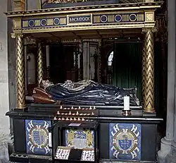 Following his death in 1626 in Winchester Palace, the bishop's residence in Southwark, he was mourned alike by leaders in church and state, and buried in St Saviour's Church (now Southwark Cathedral, then in the Diocese of Winchester). He was buried in a small chapel at the east end. After the destruction of the Bishop's Chapel in 1830, his tomb was moved to a new position, immediately behind the high altar.[14] His monument is by Gerard Janssen; the canopy was restored by Arthur Blomfield with colouring by Ninian Comper.