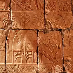 Egyptian spelling "pwenet" the second "n" is a phonetic complement to "wen" and is not spoken the last sign is the determinative for country, land | ![]() Wall relief | ![]() Huts as in relief |