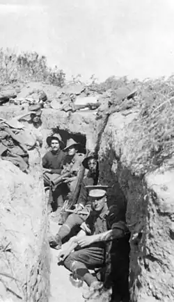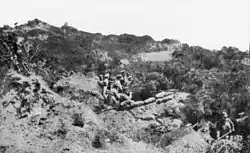 After landing, some of the 9th and 10th battalions' men headed for 400 Plateau.[108] The first 10th Battalion platoon to arrive was commanded by Lieutenant Noel Loutit, and accompanied by the brigade-major, Charles Brand. They discovered the Turkish battery in the Lone Pine sector, which was preparing to move. As the Australians opened fire the battery withdrew down Owen's Gully. Brand remained on the plateau and ordered Loutit to continue after the Turkish battery.[109] However, the guns had been hidden at the head of the gully and Loutit's platoon moved beyond them. Around the same time, Lieutenant Eric Smith and his 10th Battalion scouts and Lieutenant G. Thomas with his platoon from the 9th Battalion arrived on the plateau, looking for the guns. As they crossed the plateau Turkish machine-guns opened fire on them from the Lone Pine area.[110] One of Thomas's sections located the battery, which had started firing from the gully. They opened fire, charged the gun crews, and captured the guns. The Turks did manage to remove the breech blocks, making the guns inoperable, so the Australians damaged the sights and internal screw mechanisms to put them out of action.[111] By now the majority of the 9th and 10th battalions, along with brigade commander Maclagen, had arrived on the plateau, and he ordered them to dig in on the plateau instead of advancing to Gun Ridge.[112] However, the units that had already passed beyond there were obeying their orders to "go as fast as you can, at all costs keep going".[113]