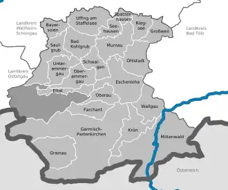 Garmisch-Partenkirchen (Bavarian: Garmasch-Partakurch) is a Landkreis (district) in Bavaria, Germany. It is bounded by (from the west and clockwise) the districts of Ostallgäu, Weilheim-Schongau and Bad Tölz-Wolfratshausen, and by the Austrian state of Tyrol.
