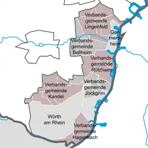 Germersheim (German: [ˈɡɛʁmɐsˌhaɪm] ⓘ)[2] is a district in the south-east of Rhineland-Palatinate, Germany. Neighboring districts are (from west clockwise) Südliche Weinstraße, Rhein-Pfalz-Kreis, the district Karlsruhe as well as the district-free city of Karlsruhe, and the French département Bas-Rhin.