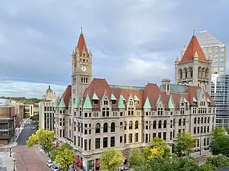The exterior is pink granite ashlar with a Ludowici clay tile roof, steeply pitched to shed snow and adorned by numerous turrets, gables and dormers.[2] Cylindrical corner towers with conical turrets occupy almost every change of projection. There are two massive towers, one of which houses a clock. The exterior is almost devoid of carved detail. The interior features a five-story courtyard with skylight and rooms with 20-foot ceilings, appointed with marble and carved mahogany and oak finishes. Its Romanesque Revival architecture is similar to Edbrooke's Old Post Office Building in Washington D.C.