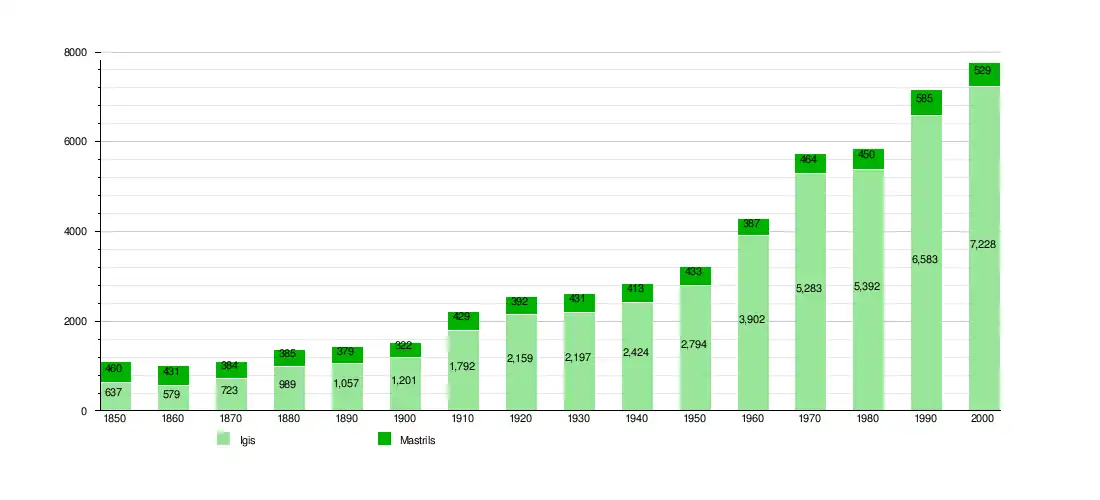 Igis is first mentioned about 840 as Ovinae/Aviuns. In 1149 it was mentioned as Auuine, in 1225 as Huiuns and in 1253 as Yges.[4] Mastrils is first mentioned in 1318 as Ponstrils. In 1345 it was mentioned as Bastrils.[5]