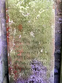 The Hill, or Over-Hill, of Dunlop was once part of the Lands of Borland and passed to the Brown family through marriage. A burial stone in Dunlop churchyard commemorates John Dunlop of Overhill and his wife, Barbara Gilmour, dated 1732. Their grandson, Andrew Brown, is also mentioned, with a date of 1794.[11]