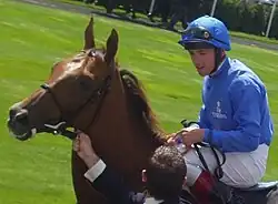 Dettori also re-established an association with trainer Gosden, notably securing victories on Golden Horn in the 2015 Derby and Enable in the 2017 Oaks and Prix de l'Arc de Triomphe.[2] In 2018 Dettori decided to end his formal association with Al Shaqab Racing in order to concentrate on riding for Gosden.[16] He rode the Juddmonte-owned Enable to further Group 1 victories, including another win in the Prix de l'Arc de Triomphe. Also in the colours of Juddmonte, stayer Stadivarius provided Dettori with three consecutive Ascot Gold Cup wins in 2018–2020.[2] The trainer and jockey fell out over Dettori's rides at 2022 Royal Ascot, in particular that on Stradivarius when he was beaten a length into third place in the Gold Cup.[17]