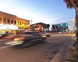 Lankershim Boulevard around Magnolia Boulevard was the heart of the town of Lankershim/North Hollywood and until the mid-1950s boasted the largest concentration of retail stores, banks, restaurants, and entertainment in the San Fernando Valley. In 1953 for example, the shopping strip included three full-line department stores: J.C. Penney, Yeakel & Goss, and Rathbun's. The street also featured branches of Harris & Frank, J. J. Newberry, and Safeway.[3] However, the nearby Valley Plaza shopping center, designed for accessibility by car and featuring plenty of free parking, opened in 1951 and by 1956 it claimed to be the third-largest shopping center in the United States.[4] Lankershim's retail district had difficulty competing and by 1980, most of its stores had closed.[5] One of the most notable closures was Donte's, one of the West Coast's best known jazz clubs in the 1970s and 1980s. It opened in 1966, closed in 1988, and is now the site of a BMW auto dealership.[6][7]