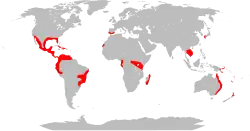 The native range of Lantana camara is Central and South America; however, it has become naturalised in around 60 tropical and sub-tropical countries worldwide.[25][26] It is found frequently in east and southern Africa, where it occurs at altitudes below 2,000 m (6,600 ft), and often invades previously disturbed areas such as logged forests and areas cleared for agriculture.[27] L. camara has also spread across the areas of Africa, Southern Europe, such as Spain and Portugal, and also the Middle East, India, tropical Asia, Australia, New Zealand, and the US, as well as many Atlantic, Pacific and Indian Ocean islands.[28][29] It has become a significant weed in Sri Lanka after escaping from the Royal Botanical Gardens in 1926.[30][31] Lantanas were brought to Australia as an ornamental garden plant in 1841, which spread and escaped domestic cultivation and became established in the wild within 20 years.[32] They were brought to India by the British around 200 years ago, which then spread and became invasive there as well.[33] A national-level monitoring in 2023 found that L. camara has invaded around 50% of the natural areas in India.[34]