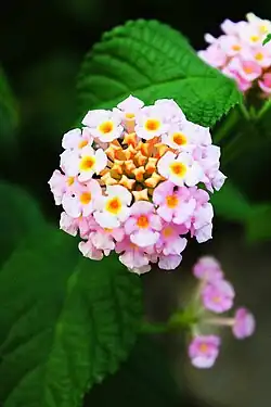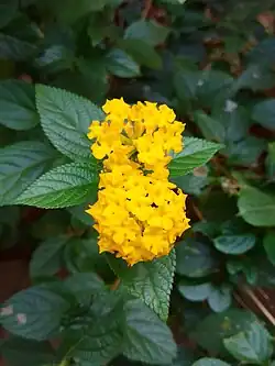 L. camara has small tubular-shaped flowers, which each have four petals and are arranged in clusters in terminal areas stems. Flowers come in many different colours, including red, yellow, white, pink and orange, which differ depending on location in inflorescences, age, and maturity.[16] The flower has a tutti frutti smell with a peppery undertone. After pollination occurs, the colour of the flowers changes (typically from yellow to orangish, pinkish, or reddish); this is believed to be a signal to pollinators that the pre-change colour contains a reward as well as being sexually viable, thus increasing pollination efficiency.[17] In frost-free climates the plant can bloom all year round, especially when the soil is moist.[18]