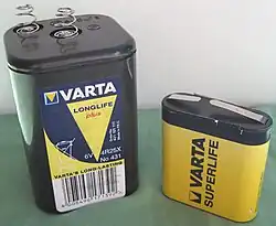 A lantern battery is a rectangular battery, typically an alkaline or zinc–carbon primary battery, used primarily in flashlights or lanterns. Lantern batteries are physically larger and consequently offer higher capacity than the more common flashlight batteries. Lantern batteries comprise multiple cells inside a housing.