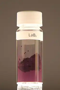 Lanthanum hexaboride (LaB6, also called lanthanum boride and LaB) is an inorganic chemical, a boride of lanthanum. It is a refractory ceramic material that has a melting point of 2210 °C, and is insoluble in water and hydrochloric acid.[1] It is extremely hard, with a Mohs hardness of 9.5.[2] It has a low work function and one of the highest electron emissivities known, and is stable in vacuum. Stoichiometric samples are colored intense purple-violet, while boron-rich ones (above LaB6.07) are blue. Ion bombardment changes its color from purple to emerald green.[3] LaB6 is a superconductor with a relatively low transition temperature of 0.45 K.[4]