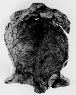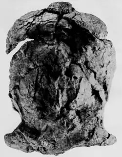 The Gongwangling skull is relatively complete, and comprises the frontal bone (forehead), most of the parietal bones (top of the head), the right temporal bone (sides of the head), the bottom margins of the nasal bones (between the eyes), and pieces of the maxillae (upper jaws). It is a bit distorted, with the right orbit jutting out farther than the left, several elements are slightly flattened, the depressions and the middle of the frontal bone are craggy due to corrosion, and the left parietal flexes out a bit more than normal. Based on the size and wearing of the molars (and assuming they degrade faster than those of modern humans), Woo estimated the individual was a 30 year old female. Overall, the skull is quite archaic, according to Woo reminiscent of the contemporary Mojokerto skull from Java.[4] Woo calculated a brain volume of about 780 cc, which is quite small for H. erectus.[4] For comparison, later Asian H. erectus average roughly 1,000 cc,[13] and present-day modern humans 1,270 cc for males and 1,130 cc for females.[14] Contemporary African archaic humans (H. habilis, H. rudolfensis, and H. e? ergaster) ranged from 500–900 cc.[15]
