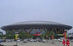 The Laoshan Velodrome Interior during the 2008 Summer Olympics The Laoshan Velodrome (Chinese : 老山自行车馆 ; pinyin : Lǎoshān Zìxíngchēguǎn ) is a velodrome that is located in Laoshan, Shijingshan District , Beijing , China . It was built for the 2008 Summer Olympics . The venue was tested during the UCI Track World Cup in December 2007.[ 1]