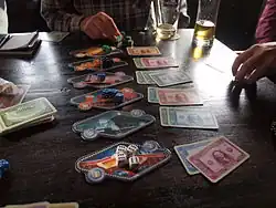 Once all players have bet all their dice, the winnings are dealt out. For each casino, the winnings go to the player who bet the most dice on that casino. The majority has to be strict - on a draw, the winnings go to the player with the next most dice, or if all players are equal, the winnings go back to the deck. In case a casino holds multiple bills, the top player receives the largest bill, and the smaller ones in order of decreasing value are awarded to the runner-up players, with unawarded bills being returned to the deck.