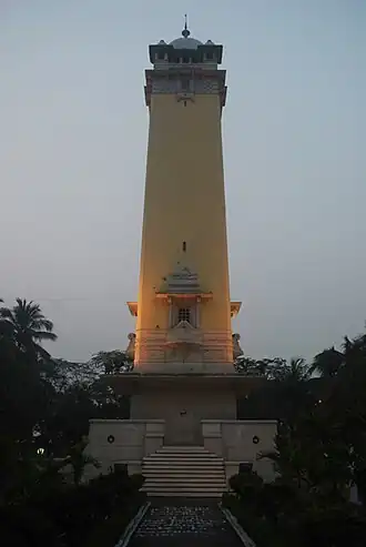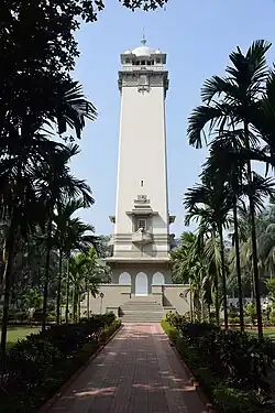 The Lascar War Memorial was erected by shipping and mercantile companies, in the memory of the 896 Lascars of undivided Bengal and Assam who lost their lives during World War I.[5] The monument is situated at the southern end of the Maidan, on Naiper Road, Hastings, near Prinsep Ghat. The 100 feet high monument was unveiled by Lord Lytton, then Governor of Bengal on 6 February 1924. The monument, built in typical Oriental style, is a four-sided column, having designs reflecting the prow of an ancient galley on each side of the column. The upper part of the monument consists of four small minarets and a large gilt dome. A typical Indian look has been given by adding wavy lines beneath the projected balcony, which symbolises waves, along with chhajjas and trellises.[3] The Lascar War Memorial has similarities with the victory tower of Chittor.[1] The memorial built in the Indo-Mughal style by William Ingram Keir, who also designed the Kidderpore Bridge, buildings at Bengal Engineering and Science University in Shibpur, the Indian Institute of Technology, Kharagpur, and Islamia College, and also replaced the 1934 earthquake affected spire of St. Paul's Cathedral, Kolkata with a tower. William Ingram Keir won a prize of Rupees 500 for designing the memorial.[2] The inside of the Memorial is approached through a huge doorway on the Northern wall. The interior contains three plaques below the inscription "Lascar Memorial." One plaque commemorates the unveiling of the memorial by Lytton. The second plaques says that the memorial was erected by shipping and mercantile community of India in memory of the 896 seamen of Bengal Assam and upper India (the term Lascar is not used) who lost their lives in service of the British Empire in the great war of 1914 – 18. The third smaller plaques tells about the renovation and lighting of the Lascar War Memorial.