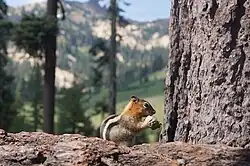 Species that are typically found in these forested areas are black bear, red fox, mule deer, marten, cougar, brown creeper, a variety of chipmunk species, raccoon, mountain chickadee, pika, a variety of squirrel species, white-headed woodpecker, coyote, bobcat, weasel, a variety of mouse species, long-toed salamander, skunk, and a wide variety of bat species.[34] Areas such as Reflection Lake attract waterfowl, including Canada geese, great blue heron, snowy egret, and kingfisher.[35]