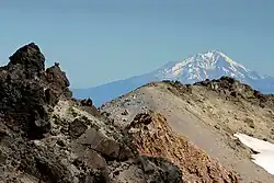 Lassen Peak is made of dacite,[20] an igneous rock, and is one of the world's largest plug dome volcanoes. It is also the southernmost non-extinct volcano of the Cascade Range (specifically, the Shasta Cascade part of the range). The 10,457 ft (3,187 m) tall volcano sits on the north-east flank of the remains of Mount Tehama, a stratovolcano that was a thousand feet (305 m) higher than Lassen and 11 to 15 mi (18 to 24 km) wide at its base.[8] After emptying its throat and partially doing the same to its magma chamber in a series of eruptions, Tehama either collapsed into itself and formed a two-mile (3.2 km) wide caldera in the late Pleistocene or was simply eroded away with the help of acidic vapors that loosened and broke the rock, which was later carried away by glaciers.