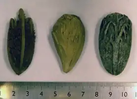 Latan palms are large, single-stemmed fan palms with separate male and female plants (dioecy); when the leaves fall, they leave scars on the trunks. Male flowers are small, in clusters, and emerge from within leathery bracts on the catkin-like inflorescences. Female flowers are larger, solitary and not concealed within bracts. The fruits contain 1-3 pyrenes, which are seeds enclosed within woody endocarps.[4] The endocarps have sculpted surfaces and the three species are readily distinguished from their pyrenes.[5]
