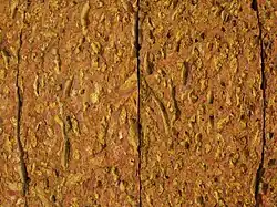 When moist, laterites can easily be cut with a spade into regular-sized blocks.[6]: 1 Laterite is mined while it is below the water table, so it is wet and soft.[19] Upon exposure to air it gradually hardens as the moisture between the flat clay particles evaporates and the larger iron salts[15] lock into a rigid lattice structure[19]: 158 and become resistant to atmospheric conditions.[6]: 1 The art of quarrying laterite material into masonry is suspected to have been introduced from the Indian subcontinent.[20] They harden like iron when they are exposed to air.[1]