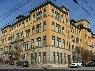 Built in 1898, this historic structure is a four-story, yellow brick building with a variety of window types and placement. It was designed by the German-born Pittsburgh architect Frederick C. Sauer (1860-1942). Closed in 1974 because there was no outdoor play area, it was purchased for conversion into apartments in 1984.[2]