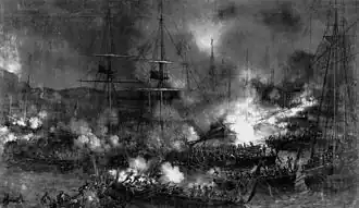 Latouche-Tréville was promoted to rear-admiral on 1 January 1793.[1] He was then sent on a mission to Napoli, after that kingdom's ambassador to Constantinople had precipitated a diplomatic conflict by insulting his French counterpart. Latouche threatened to bombard the city, and obtained apologies from Ferdinand I of the Two Sicilies.[25] Latouche then departed, but had to double back to Napoli to repair due to gale-force winds, eventually making his rendezvous with Truguet on 8 February 1793.[25] On 14 February, they landed 6,000 volunteers at Cagliari, who had to reembark under fire and in a gale two days later.[25] The fleet then returned to Toulon once more.[25]