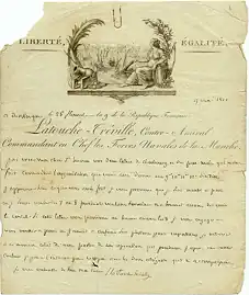 Freed, Latouche returned to Montargis, where he was appointed chief of the Legion of the National Guard for the district.[26] A Freemason, he rose to Vénérable in the Lodge Les Disciples d'Heredom et de la Madeleine Réunis, of Montargis.[28] Latouche was rehabilitated under the Directoire and had his rank reinstated in December 1795,[1] but nonetheless was left for five years without a command in the Navy.[1] From 1797 to 1798, he managed equipment for the Navy with a ship-owner friend, and by 1799 he had grown so desperate that he advertised in Le Moniteur Universel for privateer captainships.[29] It was not until 1799 that he returned to active duty.[26]