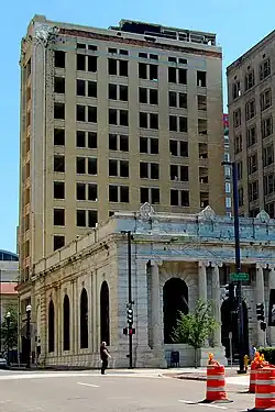 The second of the three buildings to be built, the Bisbee Building was constructed between 1908 and 1909, adjacent to the Marble Bank on Forsyth Street. It was designed by prominent Jacksonville architect Henry J. Klutho in a Chicago School-influenced Prairie Style. It was constructed amid a race against two other ten-story projects, 121 Atlantic Place and the Seminole Hotel, to build Jacksonville's first ever skyscraper. The Bisbee won the race, but 121 Atlantic Place was slightly taller, making it Florida's tallest building at the time.[4][5] The Bisbee Building was the first reinforced concrete highrise anywhere in the Southern United States, and was originally designed to be only 26 feet wide, about half its present width, but demand for office space in the trendy new edifice led the owner to have Klutho add on.[6]
