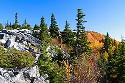 The Laurel Fork area, especially the SMA, is known to be "one of Virginia's finest examples of a northern boreal natural community".[14] The area is home to a large amount of red spruce, along with Fraser Fir, Hemlock, and various northern hardwoods.[11][14][15] Rhododendron bushes are common in the area and are described in some sections to present a "veritable barrier". It is the rhododendron, which is often called "laurel", that gave the Laurel Fork its name.[11] Sphagnum mosses along the spruce-fir forest floor are common as are berries, such as bearberry, gooseberry, and blueberries.[16]