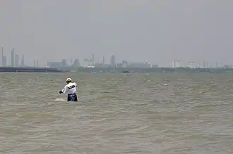 Industry is heavy along the bay, with an abundance of natural gas and oil wells at all corners. Natural gas was discovered at the site in 1934, and oil was discovered the next year. Point Comfort is home to several industrial plants along the shore, including Alcoa, Union Carbide, DuPont, and Formosa Plastics Corp. Despite the restrictions on the bay that prevent the production of fish and shellfish along the superfund site, seafood harvesting is a major industry. However, it is not as prominent as it was in the 1920s, when Port Lavaca led the nation in shrimp production, leading to the construction of a quick-freezing plant.[5] Today, shrimping is only allowed south of the Port Lavaca Causeway, due to the north's classification as a nursery location.[19] Shellfish production is allowed in Keller Bay and Lavaca Bay south of Point Comfort, but is restricted along the eastern and northern coast and Chocolate Bay, and is conditionally approved in the remaining locations, including along the shore of Port Lavaca.[20] A small tourism industry also fuels economic growth, spurred by the Port Lavaca State Fishing Pier found alongside the Port Lavaca Causeway. The pier once served as the causeway across the bay but was replaced in the 1960s and converted into a fishing pier of 3,200 feet (980 m),[21] billed as the longest in the world. However this pier is now memorialized by its remains, posts, and small platforms no longer accessible from the shore stand alongside the modern causeway.[10]