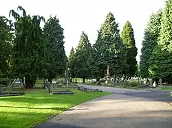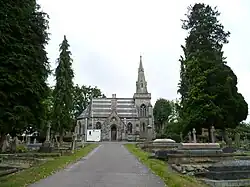 The Lavender Hill Burial Board was created in 1871 and the cemetery was opened in 1872. The site includes a sandstone lodge and gateway and two facing gothic chapels designed by Thomas J. Hill,[1] one for Anglicans and another for non-conformists, the latter subsequently turned into a store. The grounds were laid out on a serpentine scheme with many trees near the entrance on the south side.[2][3] Today the grounds total 28 acres (11.3 ha) plus a 12-acre (4.8 ha) extension known as the Strayfield Road Cemetery which opened in 1997.[1]