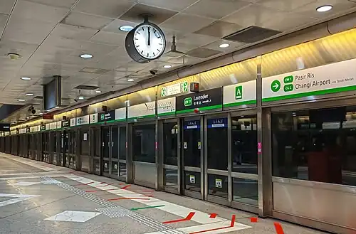 Lavender station is located under Kallang Road,[13] and is close to the ICA Building and Jalan Besar Stadium.[18] Served by the East West Line, between Kallang and Bugis stations, the station has the station code EW11.[19] When it opened, it had the station code of E2[20] before being changed to its current station code in August 2001 as a part of a system-wide campaign to cater to the expanding MRT System.[21][22] As one of the nine stations on the original MRT network built as emergency bomb shelters, the station was fitted out with steel blast doors and 2 metres (6.6 ft) thick walls of reinforced concrete.[23]