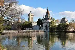 After 1780, the castle parks were re-arranged as an English landscape garden. It contains several artificial ponds, and, on an island, Franzensburg Castle, named after emperor Francis I of Austria.