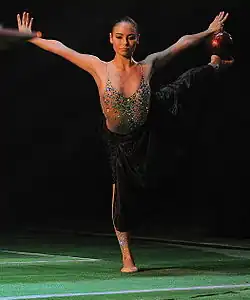 Lyasan Albertovna Utiasheva (Russian: Ляйсан Альбертовна Утяшева; Bashkir: Ләйсән Альберт ҡыҙы Үтәшева; born 28 June 1985) is a Russian socialite, television host, and former individual rhythmic gymnast. She is a two-time Grand Prix Final all-around medalist, and was an ambassador of the 2018 FIFA World Cup. Utiasheva was known for her extreme flexibility, her emphasis in point of landing on high relevé in her backsplit pivots led to a career ending injury.