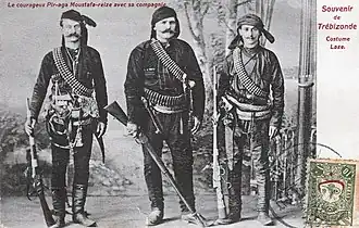 In 1547, Ottomans built coastal fortress of Gonia, an important Ottoman outpost in southwestern Georgia,[33][34] which served as capital of Lazistan; then Batum until it was acquired according to the Congress of Berlin by the Russians in 1878, throughout the Russo-Turkish War, thereafter, Rize became the capital of the sanjak. The Muslim Lazs living in newly established Batumi Oblast were subjected to ethnic cleansing; by 1882, approximately 40,000 Lazs had settled in the Ottoman Empire, especially to provinces in Western Anatolia such as Bursa, Yalova, Karamursel, Izmit, Adapazarı and Sapanca.[35] With the spread of Young Turk movement in Lazistan, the short-lived autonomist national movement headed by Faik Efendişi was established. However, it was soon eliminated as the result of Abdul Hamid's intervention.[36] During the First World War (1914–18) Russians invaded the provinces of Rize and Trabzon. However, following the Bolshevik Revolution in 1917, the Russian forces had to withdraw from the region and finally left the area to the Ottoman-Turkish forces in March 1918. From 1918 to 1920, the national movement swept rapidly all around Lazistan, committees and an interim government was created. It was oriented towards Soviet Russia. But as soon as, the Soviet-Turkish treaty of friendship was concluded, it helped the Turks, to integrate Lazistan.[37] The autonomous Lazistan sanjak existed until 1923, while the designation of the term of Lazistan was officially banned in 1926, by the Kemalists. Lazistan was divided between Rize and Artvin provinces.[38]