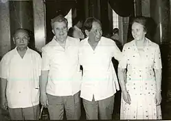 Lê Duẩn's foreign policy was criticised by Hoàng Văn Hoan, who accused him of sacrificing the country's sovereignty.[70] A delegation led by Vitaly Vorotnikov, visited Vietnam during its National Day, the holiday that celebrated the establishment of North Vietnam after the August Revolution and met with Lê Duẩn.[71] Lê Duẩn attended the 27th Communist Party Congress and later met with Gorbachev.[72] Soviet Premier Nikolai Ryzhkov and Anatoly Dobrynin attended Lê Duẩn's funeral.[73]