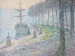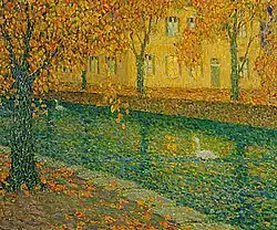 In Paris he studied under Alexandre Cabanel, one of the most influential teachers of belle époque French painting.[5] Although Cabanel mainly painted in an academic style, that were dismissed derisively as L'art pompier (literally ‘Fireman art’) by some critics,[6] he possessed a deep knowledge of nineteenth century French art, in particular of En plein air painting[note 2] and the naturalism of the Barbizon School.[7] According to his biographer Le Sidaner saw Manet's final exhibits at the Paris Salon and was deeply reflective at what he saw in the modernist Manet's work. The result was that Le Sidaner resigned from Cabanel's school, on the grounds of artistic differences.[2] Le Sidaner's interests in the use of colour, softness of form and in painting in the gloaming light were formed during this period as he sought an artistic cure in naturalism and En plein air painting.[8]
