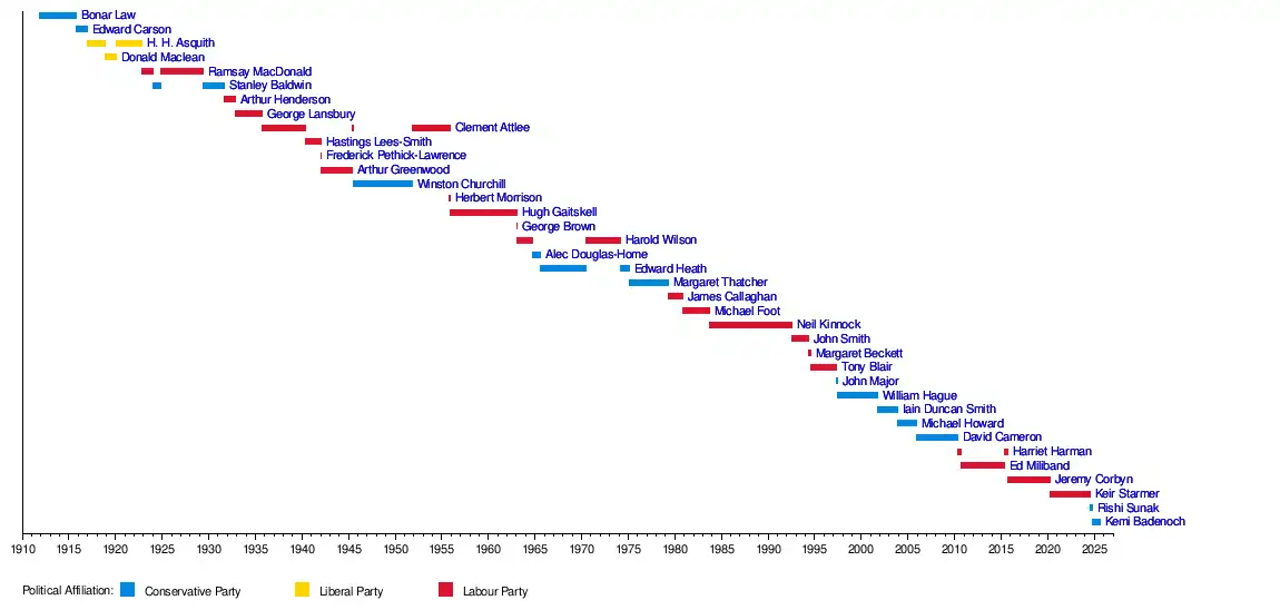 | Bonar Law[a] | 13 November 1911 | 25 May 1915 | 3 years, 194 days | — | Conservative (Scot.U.) | ||