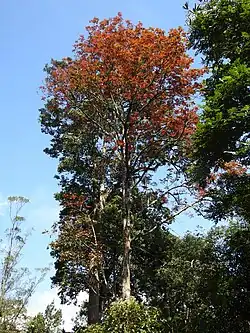 Leaf flushing or leaf out is the production of a flush of new leaves typically produced simultaneously on all branches of a bare plant or tree. Young leaves often have less chlorophyll and the leaf flush may be white or red, the latter due to presence of pigments, particularly anthocyanins.[1] Leaf flushing succeeds leaf fall, and is delayed by winter in the temperate zone or by extreme dryness in the tropics. Leaf fall and leaf flushing in tropical deciduous forests can overlap in some species, called leaf-exchanging species, producing new leaves during the same period when old leaves are shed or almost immediately after.[2][3] Leaf-flushing may be synchronized among trees of a single species or even across species in an area.[4] In the seasonal tropics, leaf flushing phenology may be influenced by herbivory and water stress.[5][6]