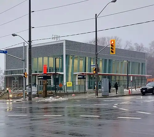 Located at the intersection with Bayview Avenue, this underground station will have two entrances on opposite corners: the main entry at the southeast (replacing a McDonald's) and a secondary entry on the northwest (in the corner of a retail parking lot).[4] Nearby destinations include Howard Talbot Park, Leaside High School, Mount Hope Catholic Cemetery, and the Sunnybrook Health Sciences Centre complex.