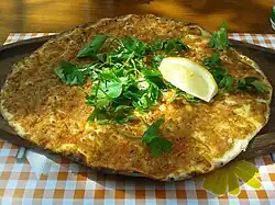 Lebanese cuisine is the culinary traditions and practices originating from Lebanon. It includes an abundance of whole grains, fruits, vegetables, fresh fish and seafood. Poultry is eaten more often than red meat, and when red meat is eaten, it is usually lamb and goat meat. Dishes include copious amounts of garlic and olive oil, and dishes are often seasoned with salt and lemon juice. Chickpeas and parsley are also staples of the Lebanese diet.[1][2][3][4]