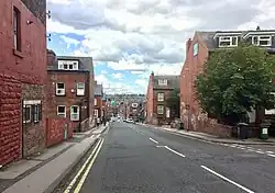 The park, consisting of 20 acres (0.081 km2) of Clapham's land between Queens Road and Hyde Park Road, was purchased jointly by a group of his mortgagees – William Ingham, an upholsterer, Thomas Hattersley, a spindle maker, and Richard Robinson, a linen merchant, all of Leeds. After a year, Hattersley bought the other two out for £3,333 in 1875. In the same year, he sold off the top 10 acres to the newly established Leeds Horticultural Gardens Company for £13,000 to continue in use as a park, and commissioned the Leeds architect Thomas Ambler to lay out the lower half of the estate for housing.[10] The plan showed a network of streets to receive small terraces mainly parallel to Queens Road, which had not yet been sewered or paved, and a number of plots to receive a better class of houses facing Brudenell Road – the original name of Clapham Road was dropped about this time as the Victorians appeared not to like streets named after businessmen who were failures.[15]