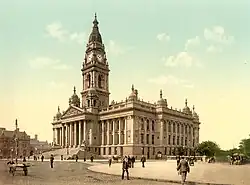 The neighbouring town of Bradford, the "wool capital of the world", took the lead in trying to elevate industrial Yorkshire towns with stately, grand architecture by building St George's Hall in 1851–53.[22] It was a new status symbol, and as there was perpetual competition between Leeds and Bradford, calls grew within Leeds for its own town hall.[23] The physician and social reformer Dr John Deakin Heaton became a major advocate and campaigner for a town hall, having visited Europe and enviously remarked on the "famous old cities whose Town Halls are the permanent glory of the inhabitants and the standing wonder and delight of visitors from a distance".[24] His, and other supporters', belief was that "if a noble municipal palace that might fairly view with some of the best Town Halls of the Continent were to be erected in the middle of their hitherto squalid and unbeautiful town, it would become a practical admonition to the populace of the value of beauty and art, and in course of time men would learn to live up to it".[25][24]