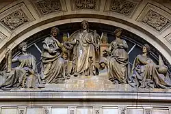 The tympanum above the south entrance is by the sculptor John Thomas (1813–1862). The figures represent Progress, Art and Commerce.[2] The central figure is Athena, who has a laurel wreath, distaff, judicial chair, and owls taken from the Leeds coat of arms and from her own set of animal attributes. From left, the other four main figures are Industry with an anvil and a bale of cloth, Poetry and Music with a faun's head and a flower-swag, Fine Arts with a Corinthian capital and a bust of Minerva, and Science with a compass, globe and tools.[17]