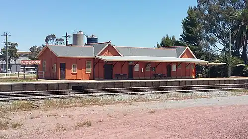 The original arrangement at Leeton included a crossing loop between the platform road and the goods loop siding, the latter serving a goods shed and loading dump platform. At the Down side of the yard there were various sidings including those for the Leeton canning factory and butter factories, and on the Down side there was also a stock loop siding for stock races. A triangle for turning locomotives was provided behind the passenger station.[6][1]