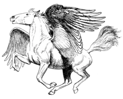 An origin evoked by Désiré Monnier for the winged and flying horses is that of Pegasus of Greek mythology, who would have "left his footprints all over the Jura region". The castle of the Jura eagle could be likened to Mount Olympus and the top of a mountain near Foncine-le-Haut to the Greek Mount Parnassus.[42][43] The origin of the image of the "winged horse on top of a mountain" is, according to him, clearly linked to the myth of Pegasus. The riding sylph of Bonlieu recalls the Greek hero Bellerophon, who rode Pegasus and fell while trying to reach Olympus, and then ended up wandering on foot in the deserts, racked with worries and avoiding encounters.[44]