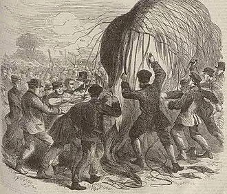 At around this time Coxwell's passengers forced their way into the balloon basket against his instructions in such a manner that prevented him from taking off.[1] The carpenters necessary to remove the scaffold from around the balloon were also not available.[8] One of the passengers then announced to the crowd that Coxwell was refusing to ascend and this, combined with his bad language and gestures, enraged them.[1] It is said that the police, who numbered only five in the vicinity of the balloon, then struck a female member of the crowd on the forehead.[8][5] She fell to the ground bleeding which is said to have caused further anger in the crowd.[5]
