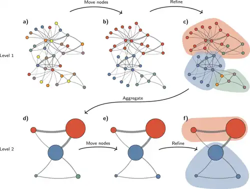 The Leiden algorithm consists of three main steps: local moving of nodes, refinement of the partition, and aggregation of the network based on the refined partition. All of the functions in the following steps are called using our main function Leiden, depicted below: The Fast Louvain method is borrowed by the authors of Leiden from "A Simple Acceleration Method for the Louvain Algorithm".[8]