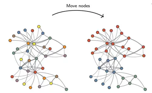 First, we move the nodes from into neighboring communities to maximize modularity (the difference in quality between the generated partition and a hypothetical randomized partition of communities). In the above image, our initial collection of unsorted nodes is represented by the graph on the left, with each node's unique color representing that they do not belong to a community yet. The graph on the right is a representation of this step's result, the sorted graph ; note how the nodes have all been moved into one of three communities, as represented by the nodes' colors (red, blue, and green).